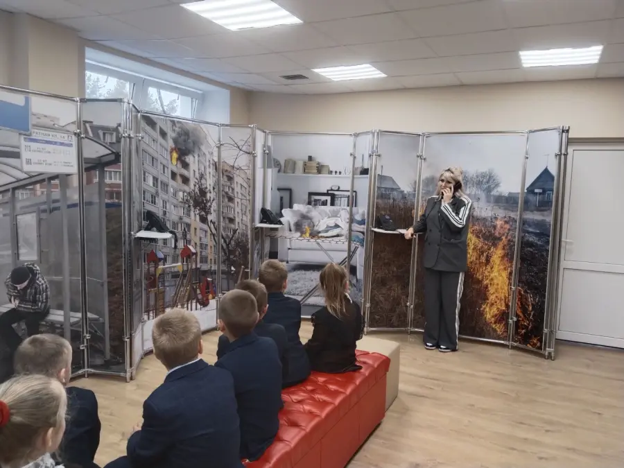 В ходе экскурсии учащиеся посмотрели  мультфильм о соблюдении правил пожарной безопасности дома,научились коллективно эвакуироваться из задымленного помещения ,