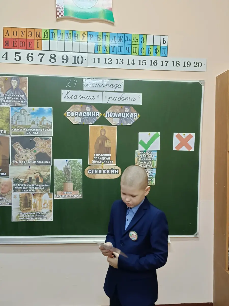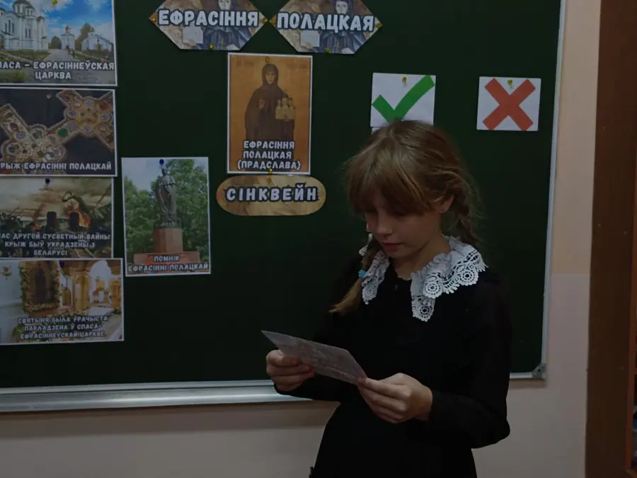 27 ноября, в рамках декады учебных предметов "Мая радзіма Беларусь", учителем Перепечений Е.С. в 4 классе был проведен урок по теме "Ефрасіння Полацкая". Урок прошел в форме исследования. Целью урока было показать учащимся в чем заключался смысл и значение религиозной и просветительской деятельности Ефросиньи Полоцкой, раскрыть большую гуманистическую роль её попыток служить своему народу и Родине. В начале урока ребята сформулировали гипотезу, которую подтверждали во время проведения исследования. На протяжении всего урока ребятам помогали проводить исследование: просмотр видеофильма, игры "Да или нет", "Установите последовательность", работа с карточками у доски, работа в группах и индивидуально. В конце урока ребята выявили, что жизнь и деятельность Ефросиньи Полоцкой - это яркий пример большого служения своей Отчизне, своему народу, и тем самым подтвердили свою гипотезу.